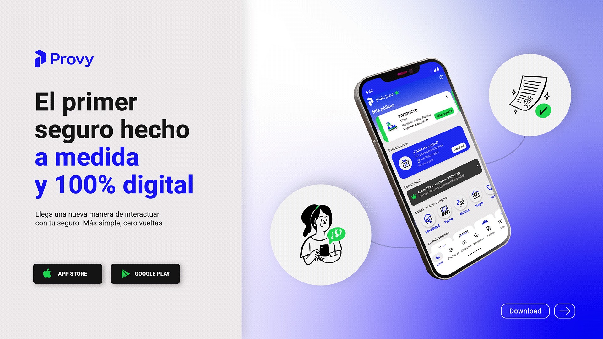 Provy is the app that offers a new way to interact with your insurance, 100% digital. An app that speaks your language—simple and straightforward. And as if that wasn’t enough, backed by Provincia Seguros.